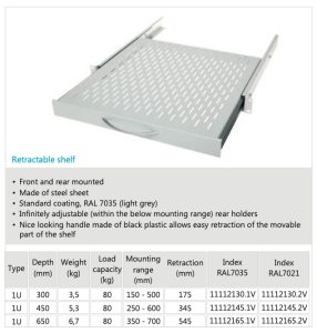 BKT retractable shelf (sliding) BKT 19″,1U, depth 450mm, mounted at 4 points RAL 7035 GREY