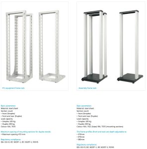 Rack-urile deschise pot fi configurate cu 2 montanți (Simplex) sau 4 montanți (Duplex), oferind astfel soluții adaptate atât pentru echipamente ușoare, cât și pentru configurații mai complexe. Construcția solidă din oțel le conferă rezistență mecanică, păstrând în același timp un design deschis care asigură ventilație naturală și acces simplificat la cabluri.