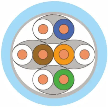 Construcția S/FTP (Screened Foiled Twisted Pair) asigură ecranare completă: fiecare pereche este protejată individual cu folie de aluminiu, iar întregul cablu are ecran general împletit (S) din plasă de cupru cositorit — reducând interferențele electromagnetice (EMI/RFI) și îmbunătățind stabilitatea transmisiei.